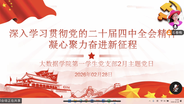 本网讯(大数据学院 文/王玉鑫 图/杨丹妮)2026年2月28日,大数据学院第一学生党支部在线开展“深入学习贯彻党的二十届四中全会精神 凝心聚力奋进新征程”主题党日。支部书记石春梅主持,支部全体党员参加。