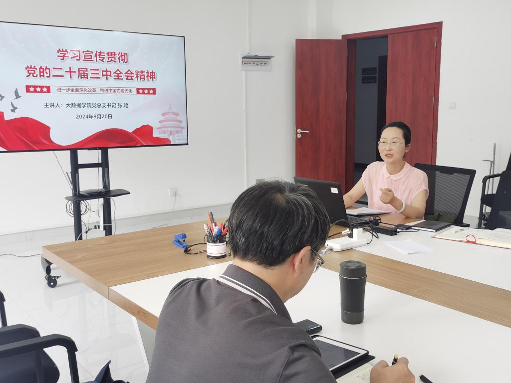 本网讯(大数据学院 潘红锐 文/图)为深入学习宣传贯彻党的二十届三中全会精神,9月20日,大数据学院在睿知楼510会议室举行党的二十届三中全会精神宣讲会。党总支书记张艳主讲,学院教师、企业教职工及学生党员代表参加。