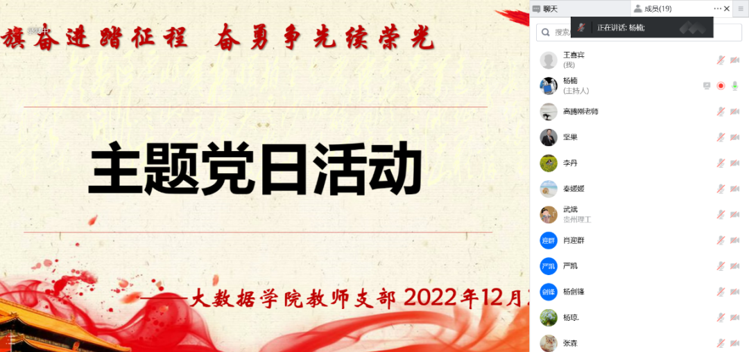 本网讯( 图/文 王喜宾)2022年12月29日,大数据学院教师党支部联合建筑与城市规划学院教师党支部,创新运用“元宇宙”数字场馆,线上线下相结合开展“擎旗奋进踏征程 奋勇争先续荣光”主题党日活动。支部书记杨楠主持,院领导张艳、肖迎群、武斌、杨仁增及教师支部全体党员参加。