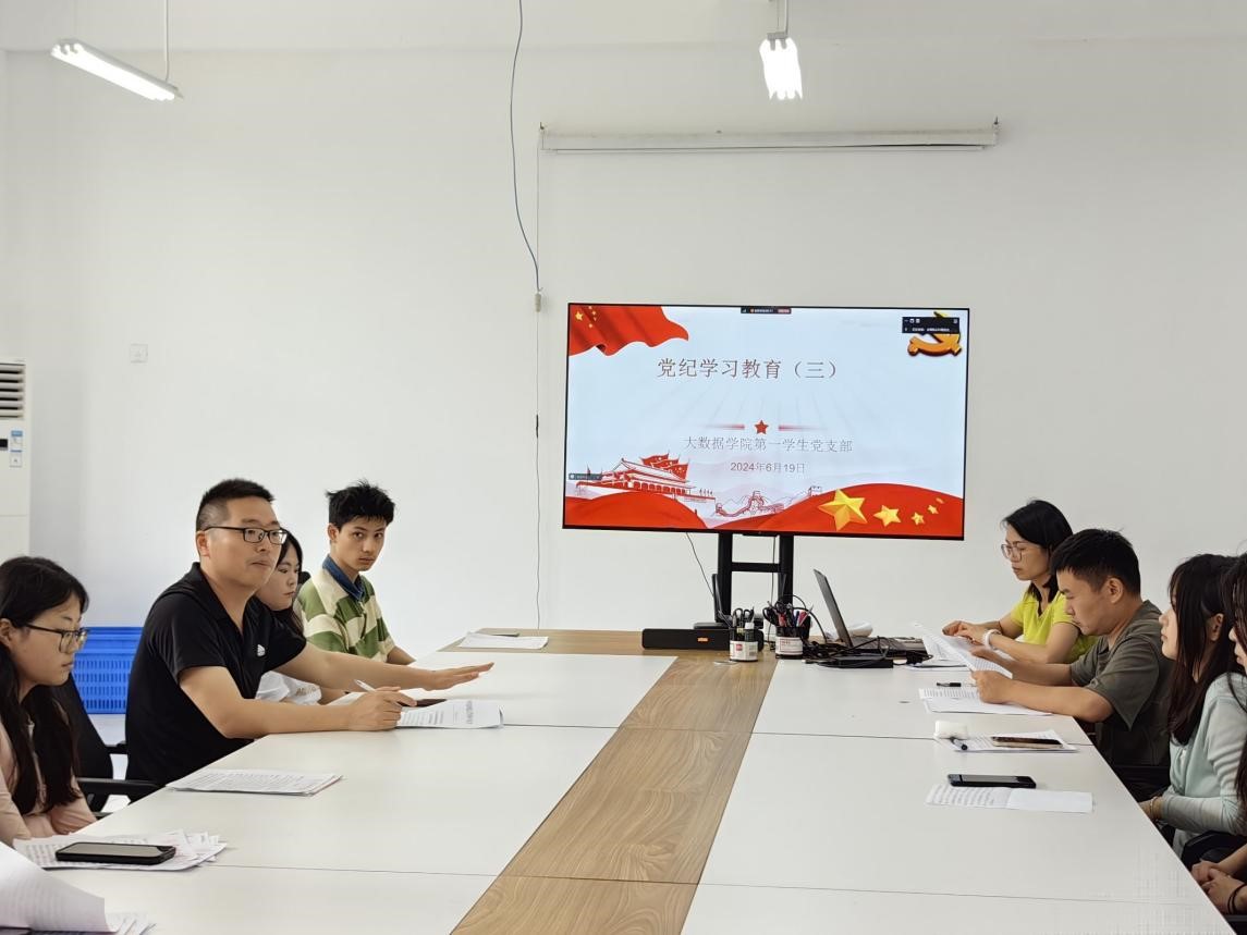 本网讯(大数据学院文/娄云洋 图/郭光彬)6月19日,大数据学院第一学生党支部在睿知楼510会议室开展“党纪学习教育”主题党日。副院长王喜宾列席指导,支部书记石春梅主持,支部全体党员参加。