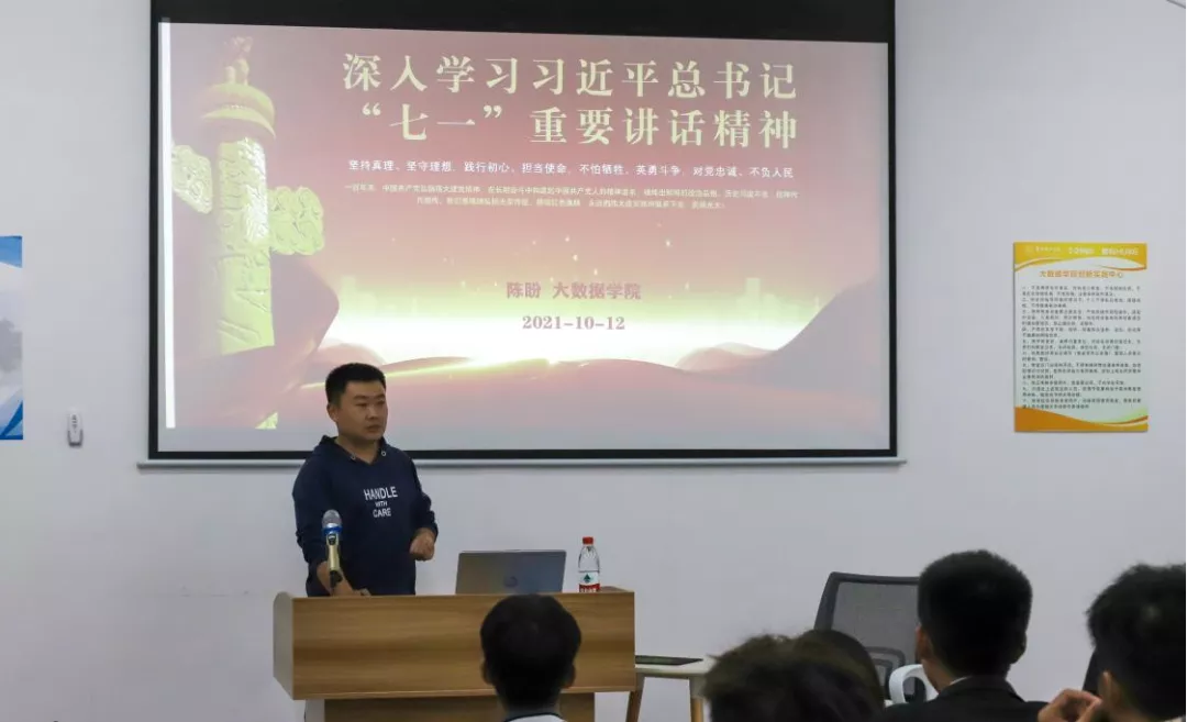 本网讯(大数据学院)2021年10月12日晚,大数据学院深入学习习近平总书记“七一”重要讲话精神暨第六届团总支学生会干部培训会在贵安校区G3301教室举行。本次培训由团总支副书记陈盼主讲,团总支学生会全体成员参加会议。