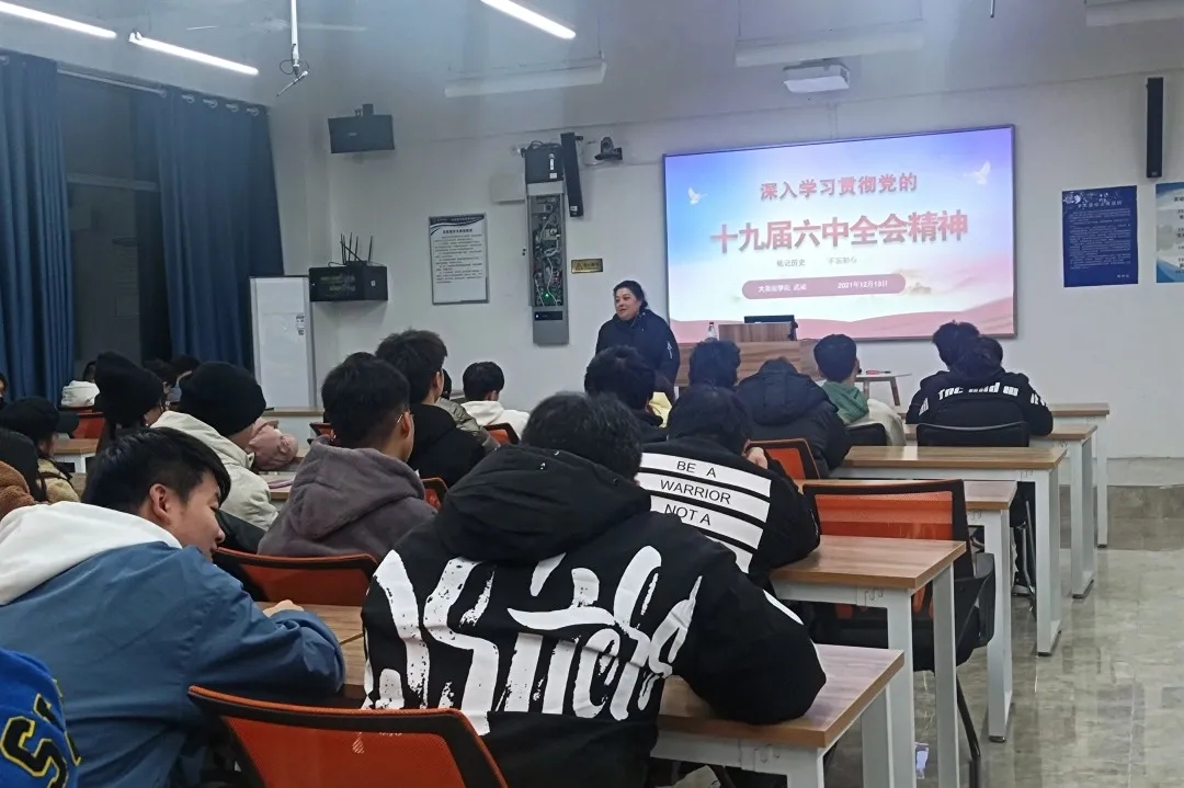 本网讯(大数据学院 文/刘江林 图/孙权)2021年12月13日晚,大数据学院党总支副书记武斌在知行楼G3302教室宣讲党的十九届六中全会精神,我院网络空间安全专业2020级全体学生聆听宣讲。