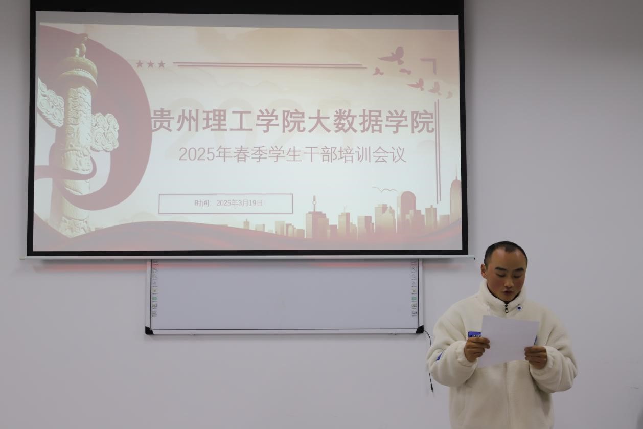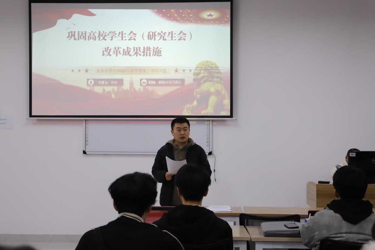 本网讯(大数据学院 文/图 余圣城)为深入学习贯彻习近平新时代中国特色社会主义思想,落实深化高校学生会改革的相关文件精神,引导学生干部牢记使命与担当,2025年3月19日晚,大数据学院在睿知楼404教室召开春季学期学生干部培训大会。学院党总支副书记武斌到会指导并领学,全体团学组织成员参会。