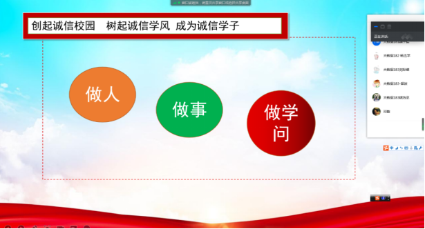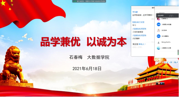 本网讯(文/刘智海)2021年6月18日晚,大数据学院组织开展“品学兼优以诚为本”线上主题思政课。2018级400余名学生参加,辅导员石春梅主讲。