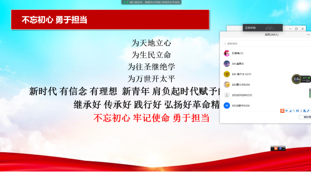 课上通报批评了当前个别大学生沉迷游戏、考试作弊等不良现象,号召青年学子继承革命传统,弘扬革命精神,以时不我待、只争朝夕的精神发奋学习,掌握真才实学,无愧青春,无愧父母,无愧祖国。