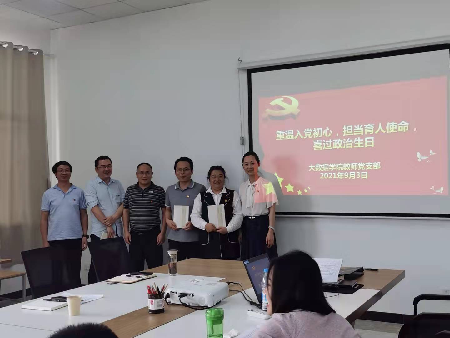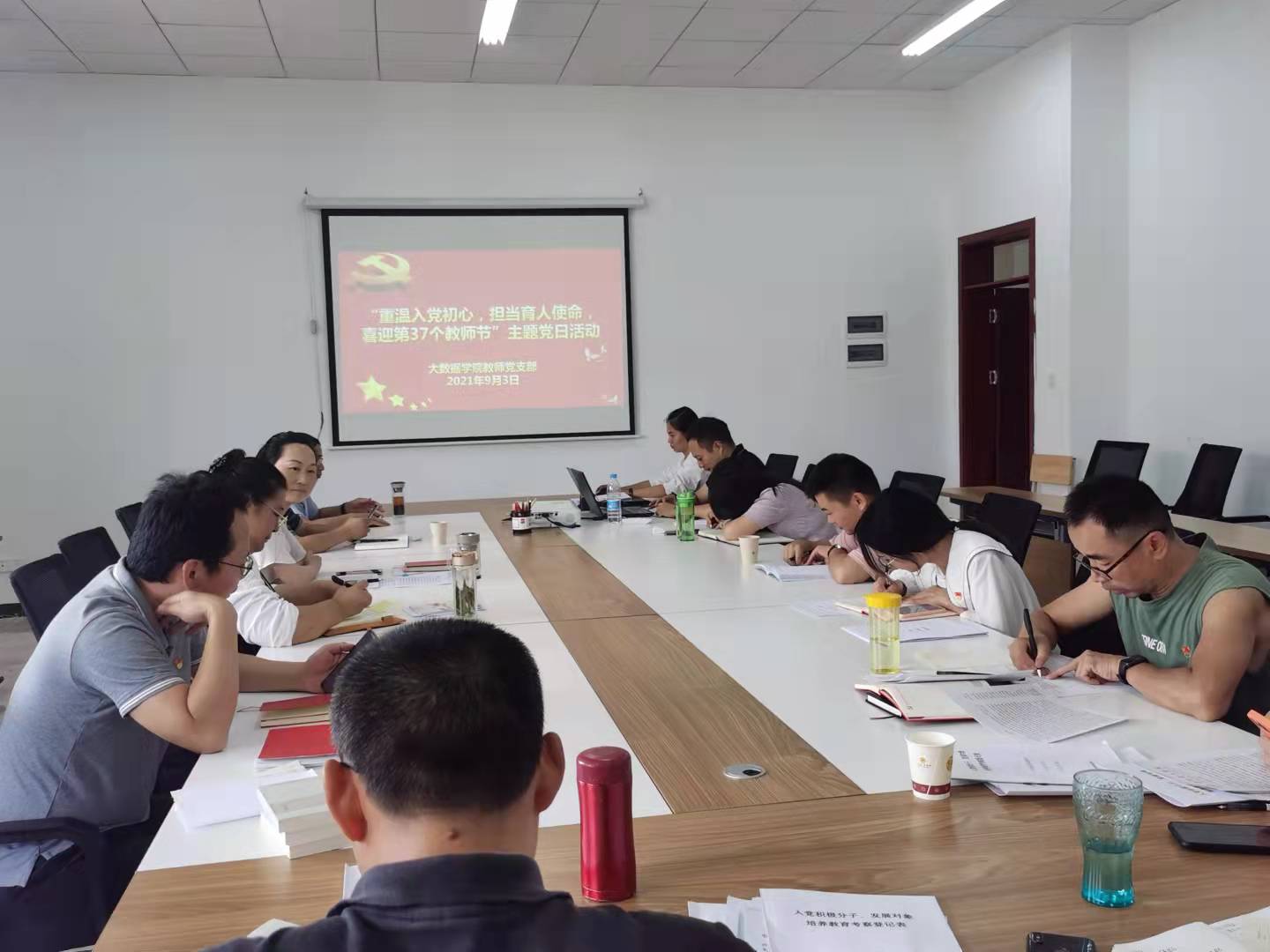 本网讯(大数据学院 张毅)为进一步强化党员身份意识,切实增强广大党员的责任感、使命感和荣誉感,在第37个教师节来临之际,2021年9月3日,大数据学院教师党支部在学院会议室开展“重温入党初心 担当育人使命 喜迎第37个教师节”主题党日活动。党总支书记张艳、院长肖迎群、党总支副书记武斌、副院长杨仁增及学院全体教师党员参加了活动,活动由支部书记杨琼同志主持。