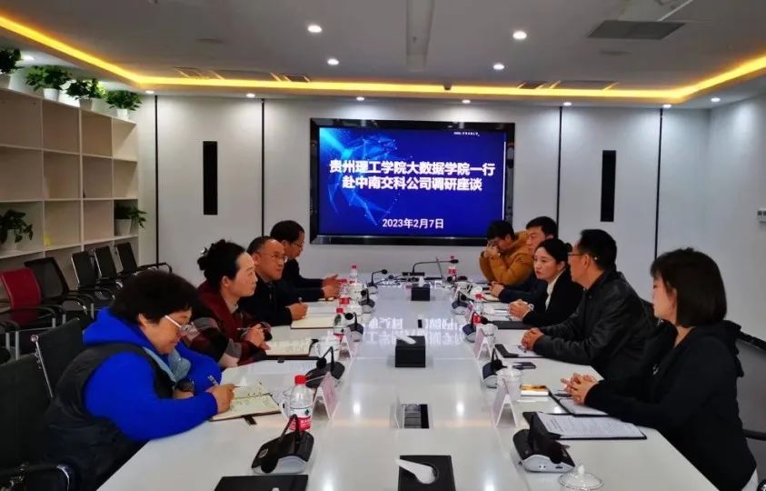 本网讯(图/文 张苏)2023年2月7日上午,大数据学院党总支书记张艳、院长肖迎群等一行5人赴贵州中南交通科技有限公司(以下简称中南交科公司)考察,与中南交科公司党委副书记、副董事长、总经理王小波,党委委员、副总经理陈双就产学研深度合作事宜座谈交流。大数据学院党总支副书记武斌、副院长杨仁增参加。