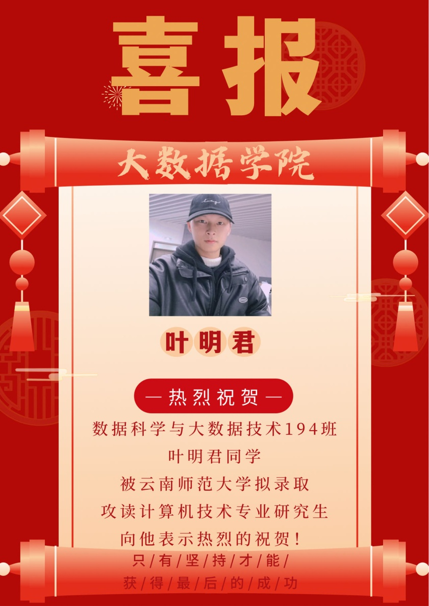 本网讯(文/孙秋韵 图/叶明君)近日,大数据学子考研喜讯频传,数据科学与大数据技术专业194班叶明君同学拟录取云南师范大学,特发喜报表示热烈祝贺!