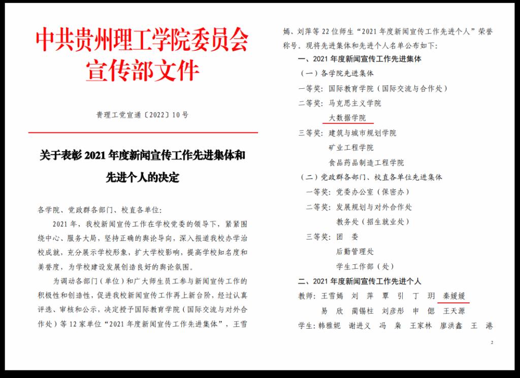本网讯(大数据学院秦媛媛)近日,校党委宣传部公布了《关于表彰2021年度新闻宣传工作先进集体和先进个人的决定》,大数据学院喜获“2021年度新闻宣传工作先进集体”二等奖,我院教师秦媛媛获“2021年度新闻宣传工作先进个人”荣誉称号。