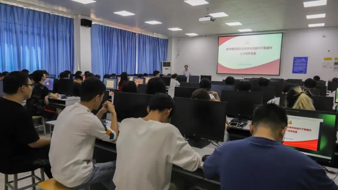 6月25日,大数据学院党总支书记张艳以《用党的创新理论凝心铸魂 为中国式现代化的贵州实践立德树人》为题,在学院会议室面向全院教职工及学生党员代表讲授专题党课。校主题教育办工作联系指导四组组长顾亚丽列席指导。