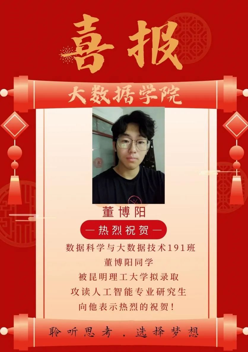 本网讯(文/董博阳 图/董博阳 李贵)在2023年全国硕士研究生招生考试中,大数据学院数据科学与大数据技术专业191班董博阳同学拟录取昆明理工大学,特发喜报表示热烈祝贺!