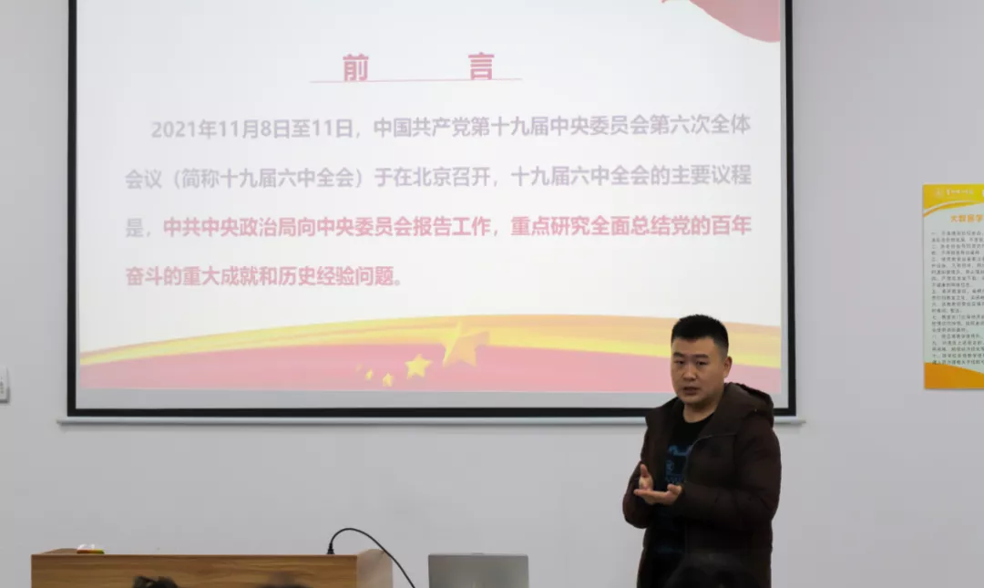 本次宣讲围绕《中国共产党第十九届中央委员会第六次全体会议公报》《中共中央关于党的百年奋斗重大成就和历史经验的决议》展开。陈盼老师带领大家学习了中国共产党领导中国人民在“救国、兴国、富国、强国”的百年征程中所取得的伟大成就和历史经验,号召青年学子听党话、跟党走,在实现第二个百年奋斗目标新的赶考之路上,努力肩负起时代使命,为实现这一伟大目标不懈奋斗。