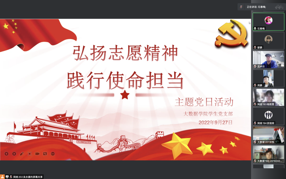 本网讯(图/廖洪鑫 文/赵晴)2022年9月27日晚,大数据学院学生党支部通过腾讯会议开展“弘扬志愿精神 践行使命担当”主题党日活动。支部全体党员参加,支部书记石春梅主持会议。