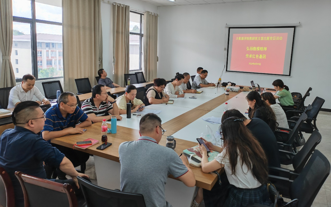 本网讯(文/图 王喜宾)2022年8月29日下午,大数据学院教师党支部在学院会议室举行“弘扬楷模精神 传承红色基因”主题党日活动。支部书记杨楠主持会议,院领导张艳、肖迎群、武斌、杨仁增及教师党员参加会议。
