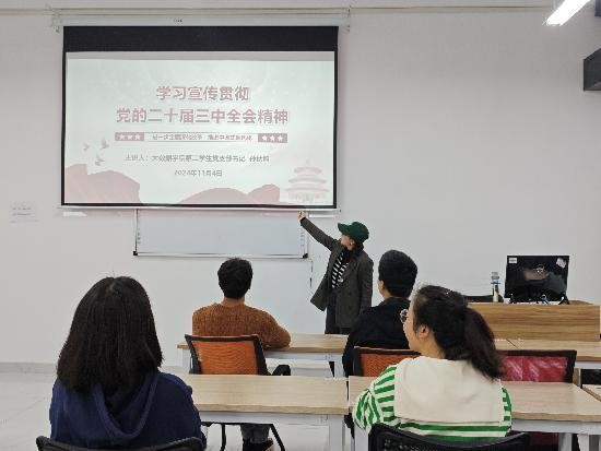 本网讯(大数据学院 文/金迪 图/赵金美)为深化学生党员对党的二十届三中全会精神的理解,11月4日,大数据学院第二学生党支部在睿知楼404教室举行“学习宣传贯彻党的二十届三中全会精神”宣讲会。支部书记孙秋韵主讲,支部全体党员参加。