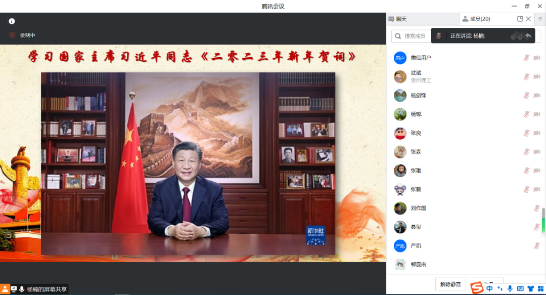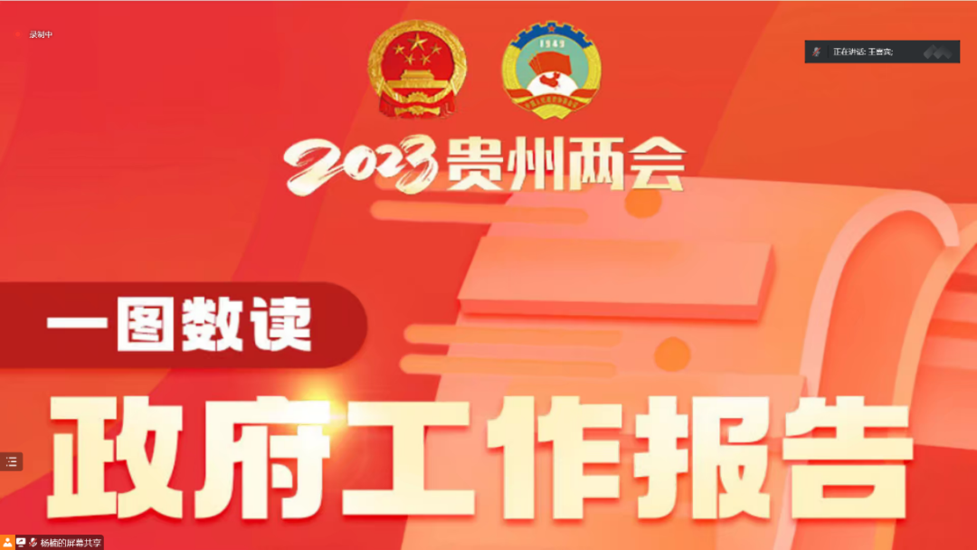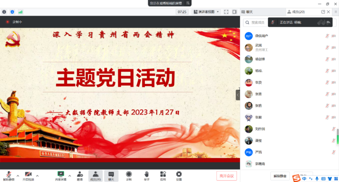 本网讯( 图/文 王喜宾)2023年1月27日下午,大数据学院教师党支部在线开展“学习贵州省两会精神”主题党日活动。支部书记杨楠主持会议,院领导张艳、肖迎群、武斌、杨仁增及教师支部党员参加会议。