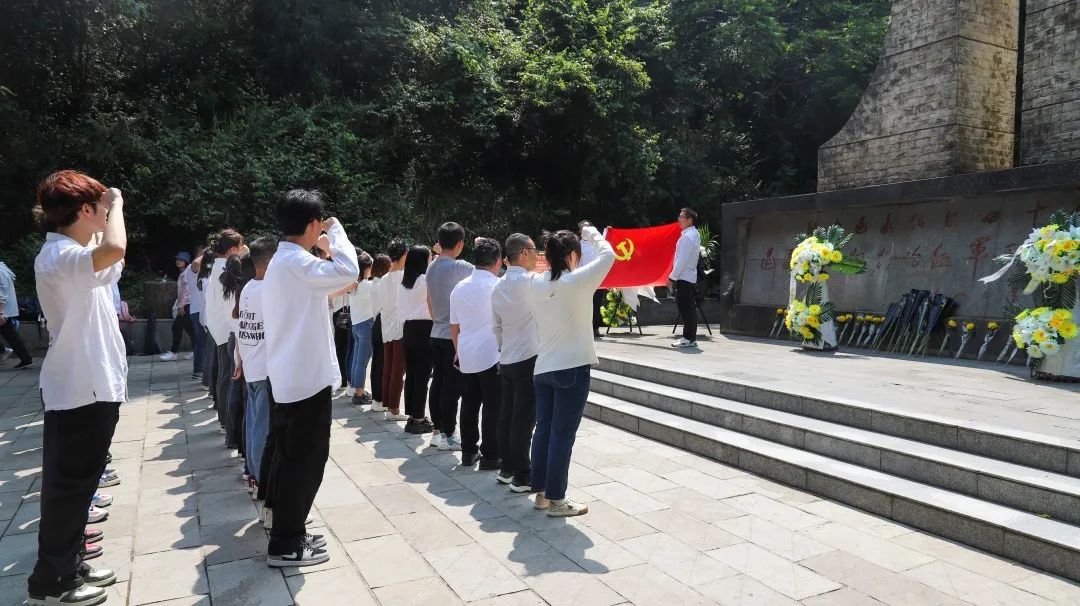 青山巍峨,翠柏苍劲。师生党员在诗词碑前用心感悟《忆秦娥·娄山关》所描述的“雄关漫道真如铁”的峥嵘岁月,在摩岩石刻近距离触摸那段惊心动魄的历史,在纪念碑前认真聆听极具感染力的微党课“一条腿的长征”,在娄山关红军战斗遗址陈列馆,跟随一幅幅图片、一件件实物追忆红军英勇鏖战娄山关的壮烈情景,倍感幸福生活来之不易。大家带着无限崇敬之情向纪念碑敬献花篮,行三鞠躬礼,深切缅怀革命先烈。在领誓人的带领下,党员同志右手握拳,面向鲜红的党旗重温入党誓词,铿锵有力的誓言表达了同志们赓续红色血脉,砥砺奋进新征程的信心决心。