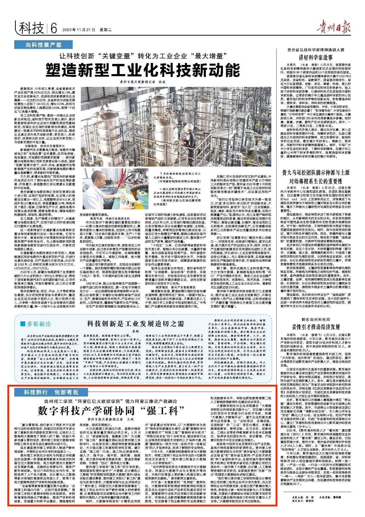 11月21日,《贵州日报》报道《贵州理工学院“阿里巴巴大数据学院”借力阿里云推进产教融合 数字科技产学研协同“强工科”》,全文如下: