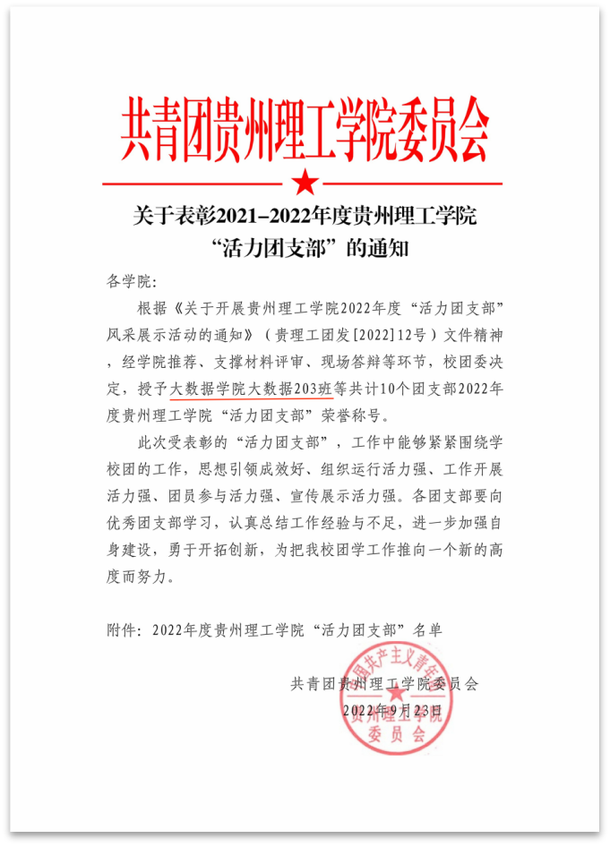 本网讯(图/大数据203团支部 文/胡伊琳)近日,共青团贵州理工学院委员会发布《关于表彰2021-2022年度贵州理工学院“活力团支部”的通知》,大数据学院数据科学与大数据技术专业 2020 级 203 班团支部被授予贵州理工学院“活力团支部”荣誉称号。