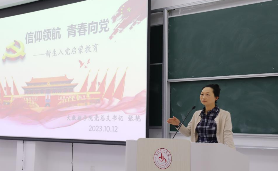 本网讯(文/何元杰 杨蓉 图/蒋钰杰)为厚植爱党、爱国、爱社会主义情感,教育引导青年学子积极向党组织靠拢,10月12日下午,大数据学院在B106教室开展2023级新生入党启蒙教育讲座。党总支书记张艳以“信仰领航 青春向党”为题给同学们上了一堂精彩的入党启蒙课。