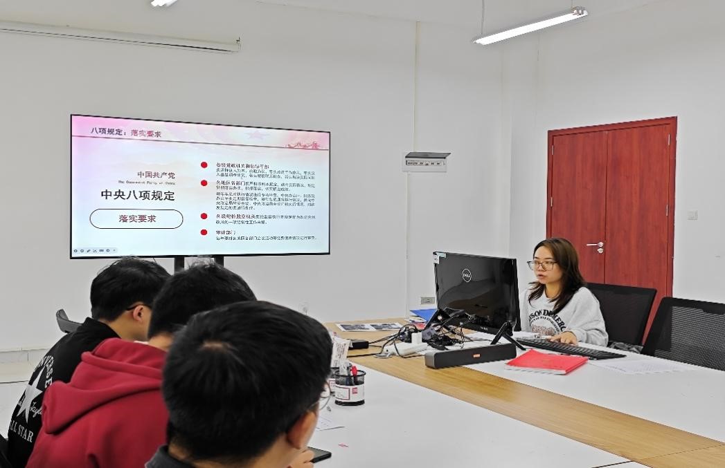 本网讯(大数据学院 文/图 赵金美)2025年4月30日,大数据学院第二学生党支部在睿知楼510会议室组织开展“深入贯彻中央八项规定精神学习教育”主题党日。支部书记孙秋韵主持,支部全体党员参加学习。