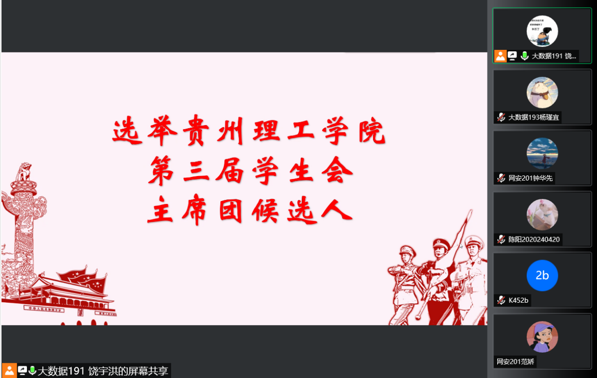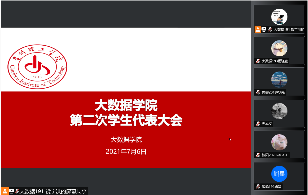 本网讯(大数据学院 熊星)2021年7月6日晚7点,大数据学院第二次学生代表大会在线上召开。本次大会由徐丽菊主持,113名代表参加大会。