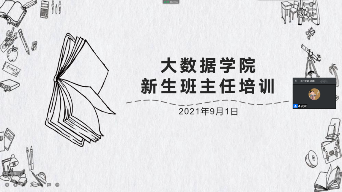 本网讯(大数据学院 陈盼)2021年9月1日晚,大数据学院在线上召开新学期第一次学生工作例会,党总支书记张艳、副书记武斌以及全体辅导员、班主任参加会议。