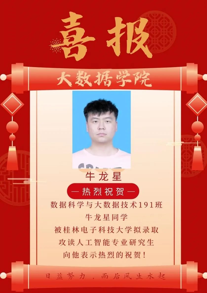 本网讯(图/牛龙星 李贵 文/牛龙星)在2023年全国硕士研究生招生考试中,大数据学院数据科学与大数据技术专业191班牛龙星同学拟录取桂林电子科技大学,特发喜报表示热烈祝贺!