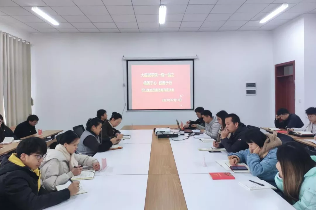 本网讯(大数据学院 文/肖燕琳 图/丁一)2021年12月17日,我院学生党支部在知行楼G3522会议室开展大数据学院一院一品之“植廉于心 践廉于行”毕业生党员廉洁教育座谈会。党总支书记张艳、副书记武斌出席会议,支委成员、全体毕业生党员参加,支部组织委员陈盼主持会议。