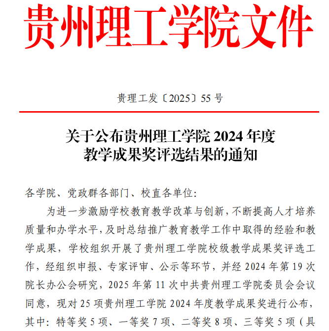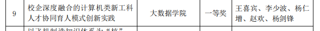 本网讯(大数据学院 文/图 石春梅)近期,贵州理工学院组织开展了校级教学成果奖评选工作,经组织申报、专家评审、公示,大数据学院王喜宾、杨仁增等老师所在团队的成果《校企深度融合的计算机类新工科人才协同育人模式创新实践》获校级一等奖。这是我院教学成果首次获此殊荣。