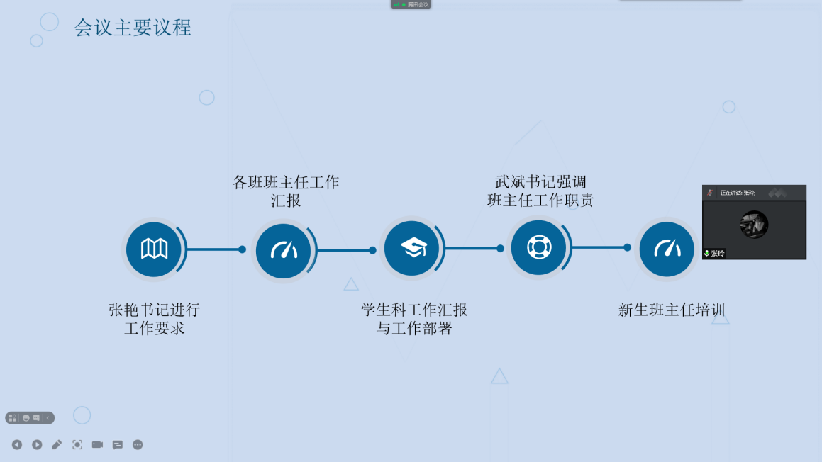 本网讯(大数据学院 陈盼)2021年9月1日晚,大数据学院在线上召开新学期第一次学生工作例会,党总支书记张艳、副书记武斌以及全体辅导员、班主任参加会议。