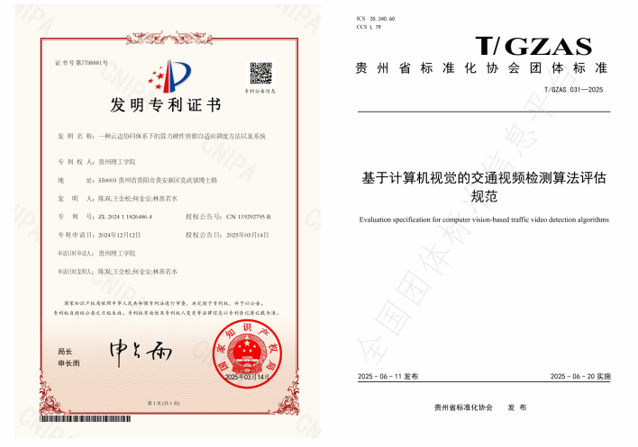 制定并发布了《基于计算机视觉的交通视频检测算法评估规范》(团体标准 T/GZAS 0312025),为行业评测提供统一依据;形成知识产权组合:该项目获发明专利授权1项、受理1项,软件著作权2项,发表高质量学术论文2篇。