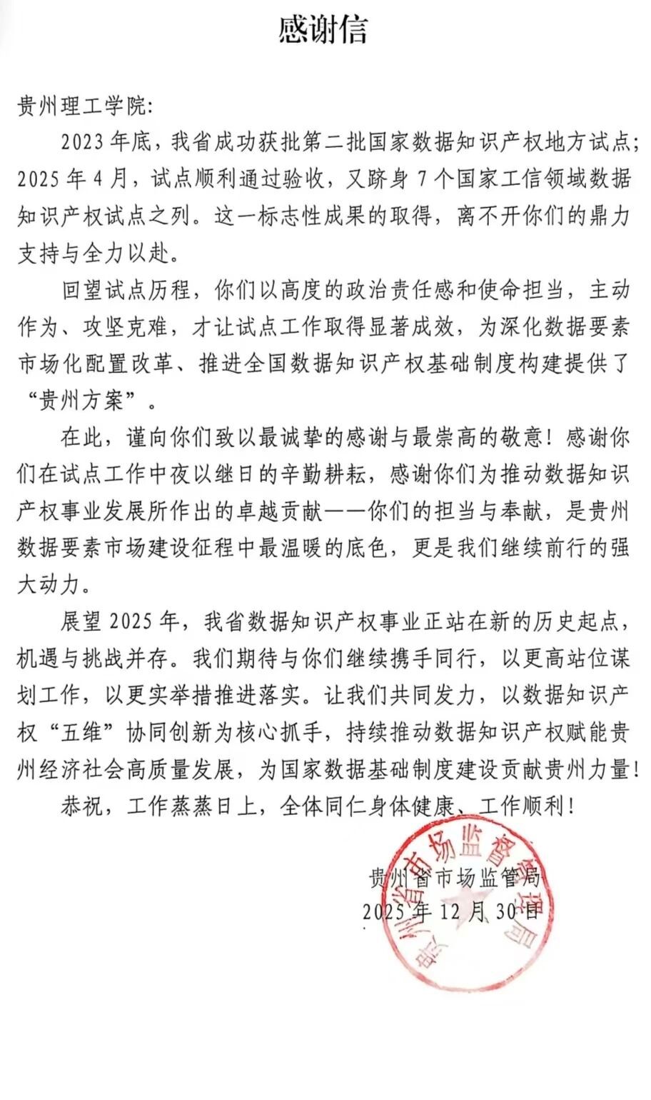2023年至2025年,我省成功获批第二批国家数据知识产权地方试点并通过验收,进而跻身7个国家工信领域数据知识产权试点之列。贵州理工学院及贵州省数据知识产权研究基地的工作为我省深化数据知识产权试点、做强做优数字经济提供了坚实有力的支撑,近日贵州省市场监督管理局向贵州理工学院发来感谢信。