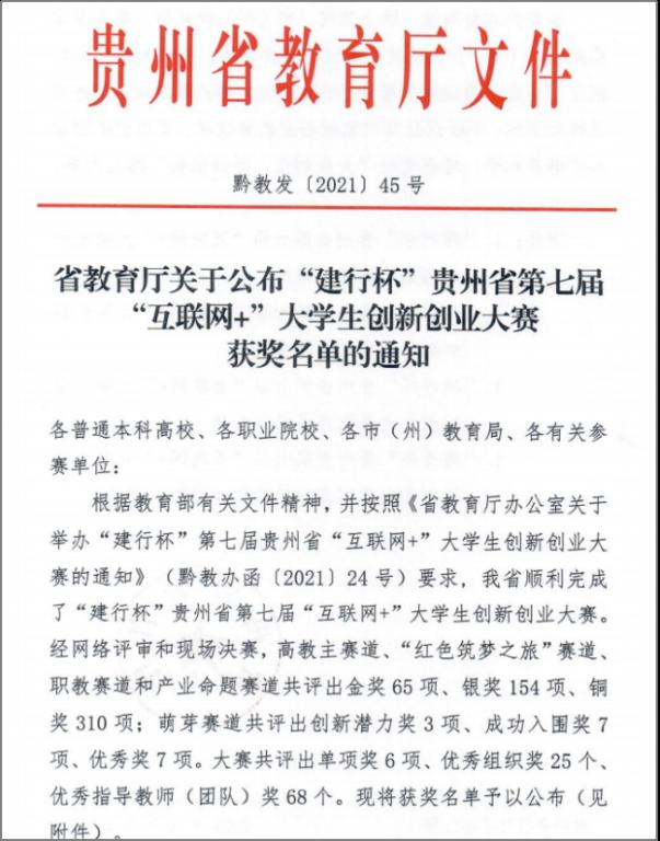 本网讯(大数据学院 文/武卓田)近日,省教育厅公布了“建行杯”贵州省第七届“互联网+”大学生创新创业大赛获奖名单,大数据学院网络193班安炉明同学所在团队项目“黑重晶石变白及改性—产品技术服务提供商”获高教主赛道金奖;大数据181班刘智海所在团队项目“智慧菌落辨识器”,大数据181班李文杰、尹雪、大数据191班王培红、大数据183班李钰、钟启华、黄启龙、邱波7名同学所在团队项目“种呗—智能分析种植平台”获高教主赛道银奖;大数据181班吴慧雯、刘德福、黄孝祥、智能181班周亚鹏、刘昕蕊、代章涛、大数据191班董博阳、牛龙星8名同学所在团队项目“家一下”获高教主赛道铜奖;大数据181班张念涛、智能181班周咏煊2名同学所在团队项目“红设计—做红色文化传播的先锋”获“青年红色筑梦之旅 ”赛道银奖。我院党员教师杨剑锋、王喜宾、石春梅参与项目指导,所指导项目分获高教主赛道银奖、铜奖。