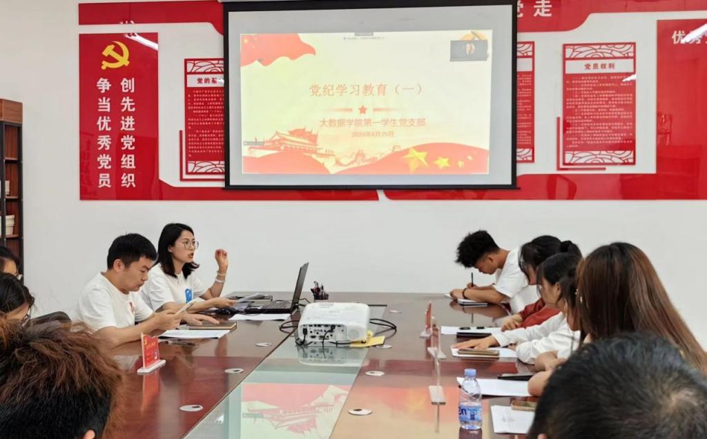 本网讯(大数据学院 文/徐丽菊 图/方禹)4月29日,大数据学院第一学生党支部在党员活动室开展“党纪学习教育”主题党日活动。支部书记石春梅主持,支部全体党员参加。