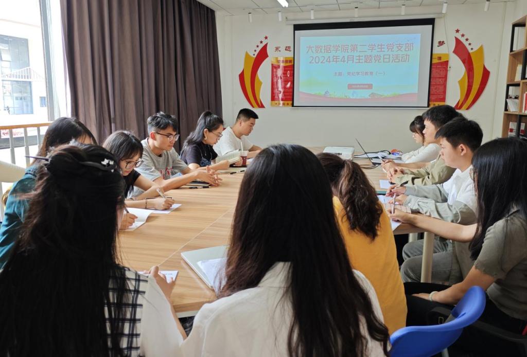 本网讯(大数据学院 文/魏良月 图/赵金美)4月28日,大数据学院第二学生党支部在“数智先锋”一站式学生社区党员活动室开展“党纪学习教育”主题党日活动。支部书记孙秋韵主持,支部全体党员参加,发展对象列席。