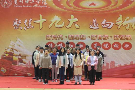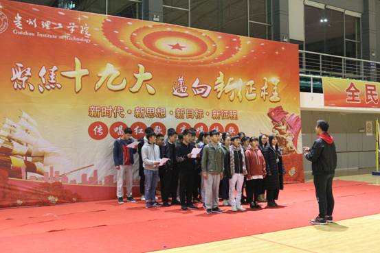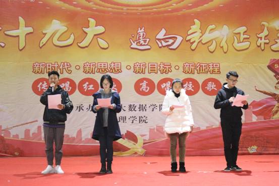 (理学院统计173班 田莉 报道)为进一步深入学习、宣传和贯彻党的十九大精神,传承红色基因,不忘赤子初心,更加团结凝聚大学生为实现中华民族伟大复兴的中国梦而努力奋斗。11月20日晚七时,理学院与大数据学院以“聚焦十九大,迈向新征程”为主题在校体育馆联合举办了一次青春洋溢的传唱红歌、高唱校歌合唱活动。