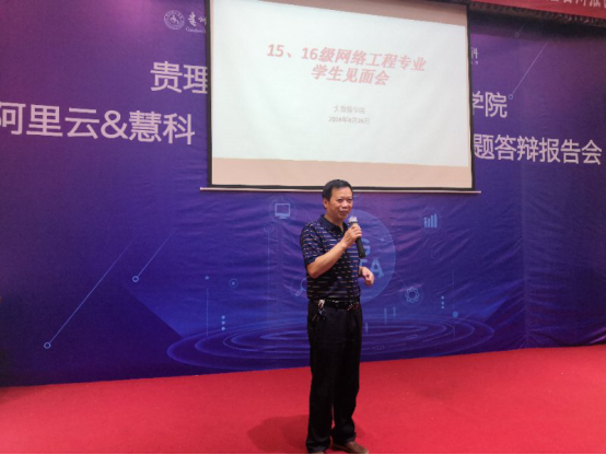 见面会上梁杰副校长作了热情洋溢的讲话,2015、16级网络工程专业的同学们经历了两次划转调整,为此,梁杰副校长代表学校向2015、16级网络工程专业的同学们因学校建设发展过程中两次划转调整归属学院表达了歉意。同时,也感谢同学们对此次划转调整的理解与支持,他代表学校向全体参会同学表达了深深的谢意。最后,梁杰副校长殷切希望2015、2016级网络工程专业的同学们到大数据学院后,好好学习相关专业知识,夯实基础,将来更好地服务贵州社会经济发展,服务全国互联网+大数据产业发展,做社会主义现代化的接班人,为实现中华民族伟大复兴中国梦而努力奋斗。