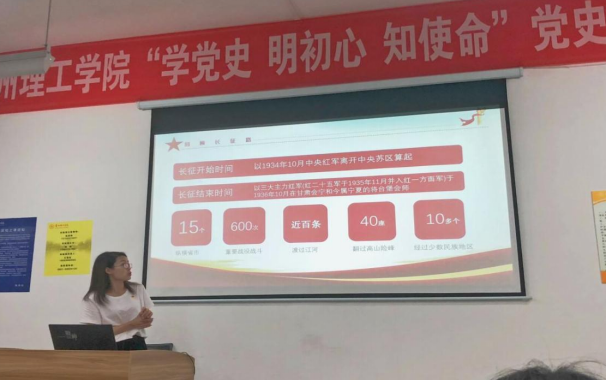 本网讯(文/白凯雯 刘海 图/王玖睿)2021年5月10日晚,大数据学院学生党支部书记石春梅以“弘扬长征精神 做好新时代接班人”为题,在贵安校区知行楼3301教室给全体学生党员、入党积极分子上党史专题党课。