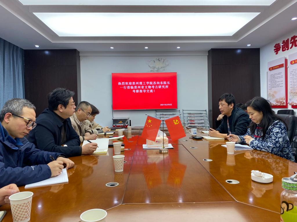 本网讯(发展规划与对外合作处)为贯彻落实习近平总书记在中央政治局第二十三次集体学习时关于“要积极培养壮大考古队伍,让更多年轻人热爱、投身考古事业,让考古事业后继有人、人才辈出”的重要讲话精神,认真落实李炳军省长在贵州省第十三届人民代表大会第四次会议政府工作报告中关于“重视考古工作,加强重要文化、自然遗产、非物质文化遗产系统性保护” 的指示精神,2月5日,校党委副书记、院长苏向东率队到贵州省文物考古研究所考察交流。贵州省文物考古研究所所长周必素、副所长张兴龙参加座谈。