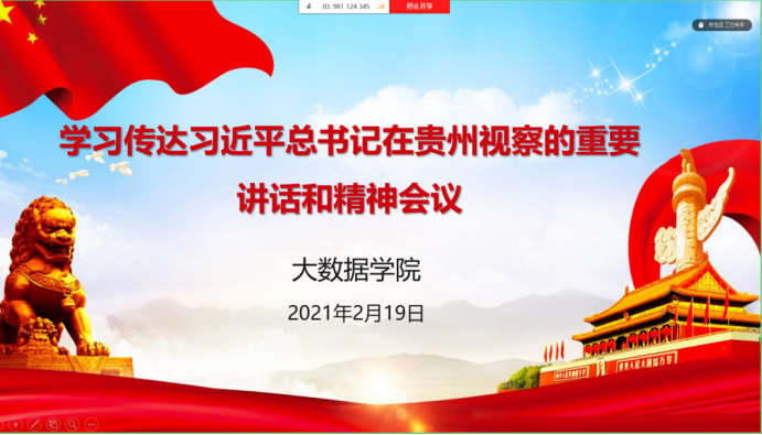 为进一步学习贯彻落实习近平总书记在贵州视察的重要讲话和精神。2021年2月19日上午,大数据学院党总支组织召开了全院师生党员线上学习会议,会议由党总支书记唐丽华主持。