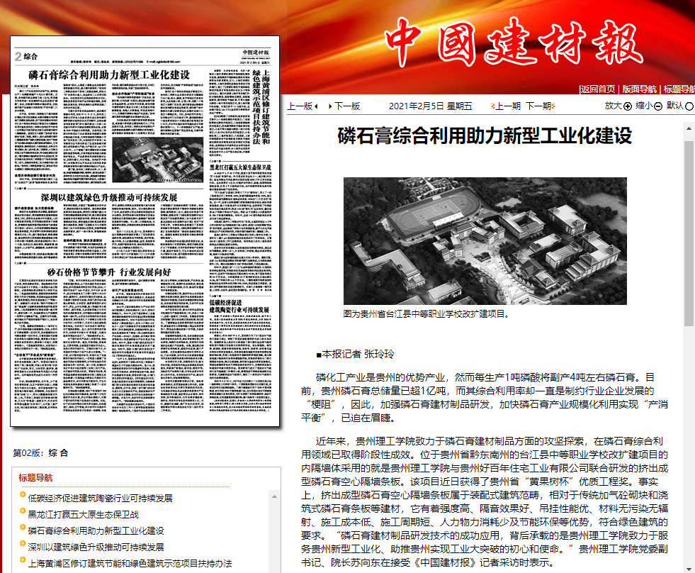 2月5日,《中国建材报》报道了我校科研团队在磷石膏综合利用领域助力贵州新型工业化发展的情况,现将全文刊载如下。