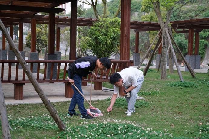 3月22日和23日下午17点50分,志愿者带着劳动工具准时到达劳动场地。大家在自己的卫生区域里有条不紊的进行清扫,他们或是用扫帚堆起散落的树叶,或是用手拾起草丛里的垃圾,一个志愿者拿着扫帚,另一个就用工具承装。大家在互帮互助中感受集体的力量,在温暖的三月体会着暖暖的温情。