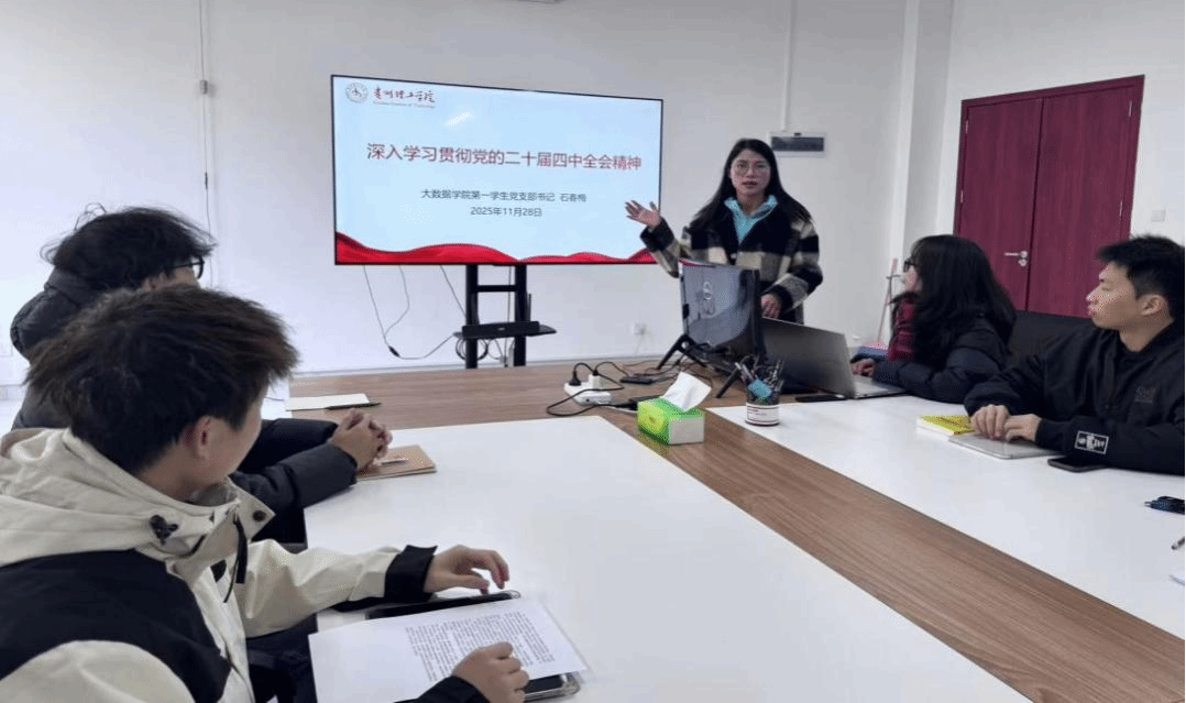 本网讯(大数据学院 文/图 袁梓熙)2025年11月28日 ,大数据学院第一学生党支部在睿知楼 510 会议室开展 “深入学习贯彻党的二十届四中全会精神” 主题党日。支部书记石春梅主持,支部全体党员参加。