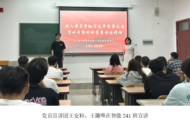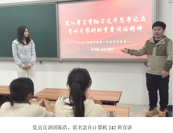本网讯(大数据学院 文/图 孙艳红)近日,大数据学院第一学生党支部学生党员宣讲团以“深入学习贯彻习近平总书记在贵州考察时的重要讲话精神”为题,面向我院2024级学生及入党积极分子共200余人开展“理论宣传二人讲”。
