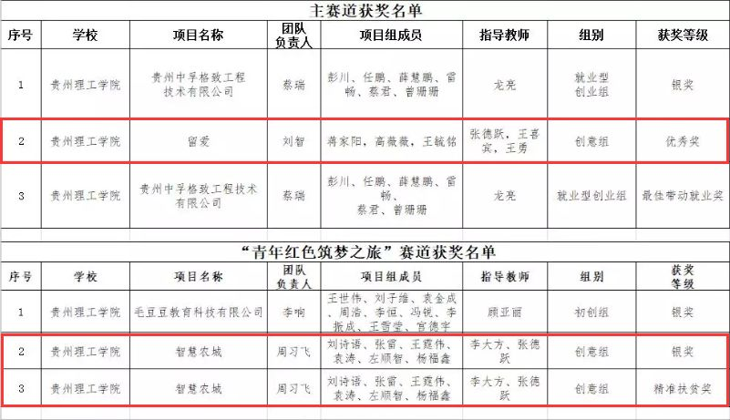2018年9月4日,第四届中国“互联网+”大学生创新创业大赛贵州省赛决赛圆满落幕,大数据学院共有2组参赛队伍进入省决赛,其中 “七个我”团队的“智慧农城”项目荣获省赛决赛“青年红色筑梦之旅”赛道银奖和精准扶贫奖;“飞跃”团队的“留爱”项目荣获贵州省赛决赛主赛道优秀奖。