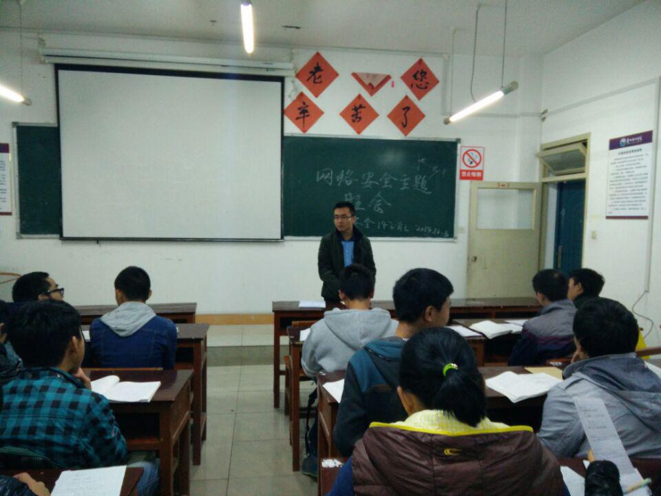 本网讯(侯宗良 供稿)为积极响应学校开展的首届国家“网络信息安全宣传周”活动。2014年12月3-4日晚,我院组织安全141、安全142、安全143、非矿141、采矿141、采矿142分别在三教各班自习室开展了网络安全教育活动。