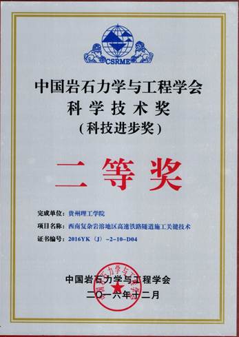 贵州理工学院作为完成单位获中国岩石力学与工程学会科技进步奖二等奖