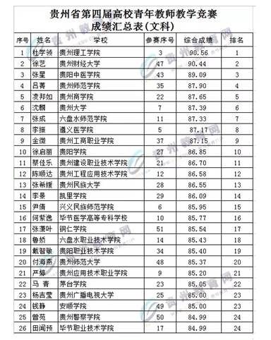 (本网讯 魏玮)从省教育厅获悉,7.12-15日,由贵州省教育厅和省总工会联合举办的贵州省第四届高校青年教师教学竞赛在我校顺利举行,竞赛共有来自全省59所高校的190名优秀选手参赛,比赛分六个组分别进行,其中文科组(51人)、理科组(22人)、工科组(21人),并单设思想政治课专项(43人)和高职高专理科(22人)、高职高专工科(31人)。我院教师杜学领副教授主讲的全校公共选修课程《旅行安全与旅游文化》在激烈的竞争中力压群芳,脱颖而出,荣获文科组第一名。从相关文件获悉,各组别第一名将授予贵州省五一劳动奖章。