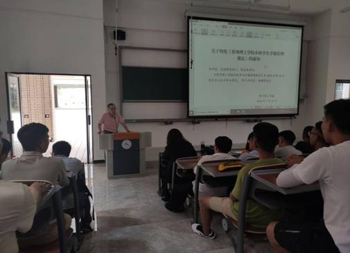 副院长马林联、王庆分别就贵州理工学院学生学籍管理规定、贵州理工学院学生处分管理规定等内容进行专题介绍,并就适应问题、安全问题进行专题教育。